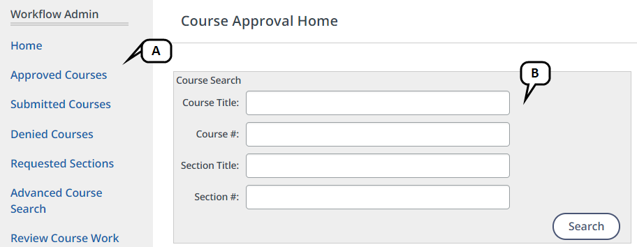 - Workflow Admin Menu - Click a menu option to locate and view courses in the approval workflow.