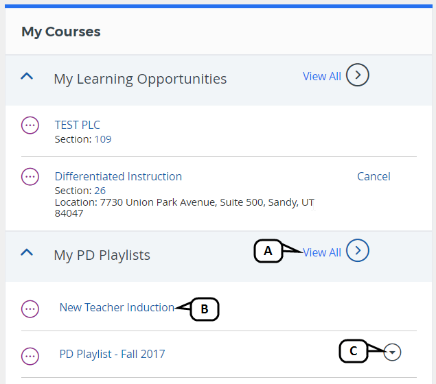 Upon clicking View All, your My PD Playlists dashboard displays a summary list of each playlist for which you are a participant and includes the following features.