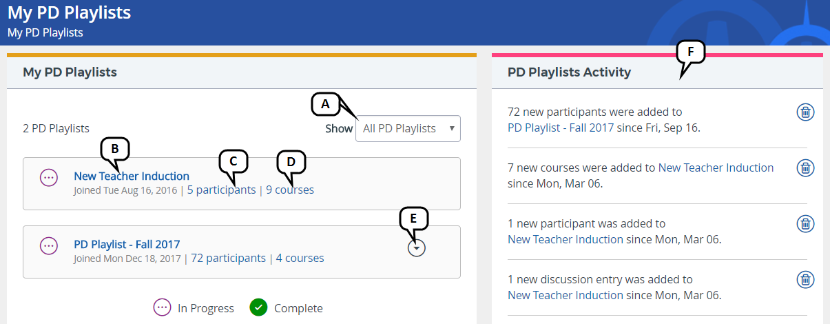 - View actions taken on any of your playlists in the PD Playlists Activity box. Click the trash can icon to remove reviewed activities.