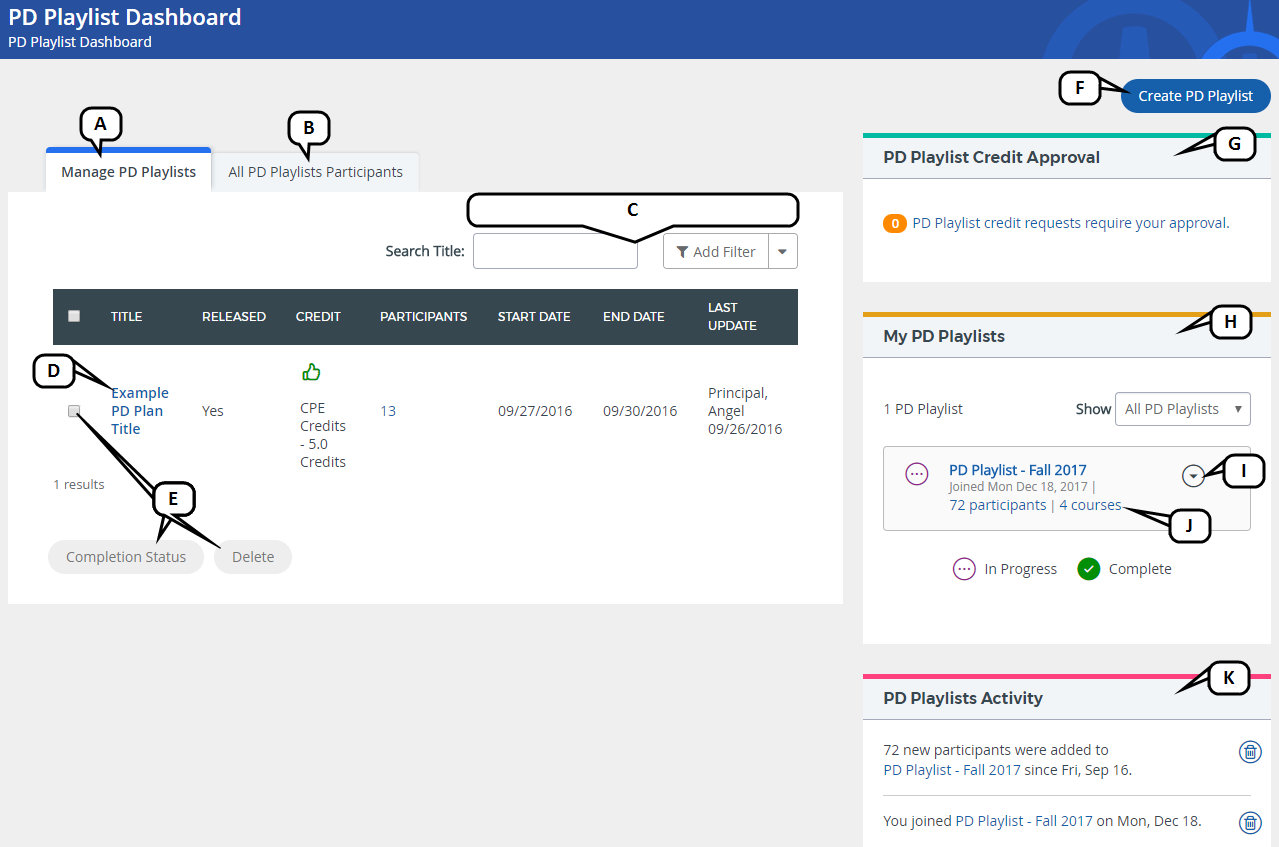- Completion Status - view the course completion status for participants of the selected PD playlist
