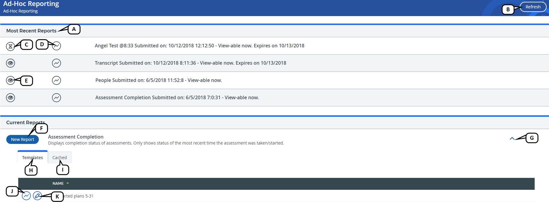 Your Ad Hoc Reporting dashboard appears. On the top, you will see the most recent reports displayed. Beneath the recent reports, you will see a section containing the current reports.