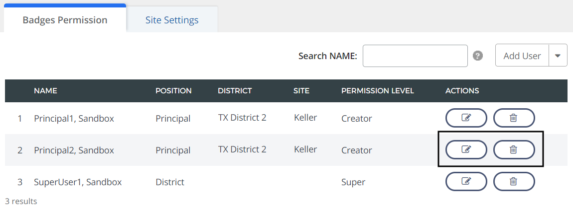 - On the Badges Permission tab, the current assignments will be listed. Click the pencil icon to change a user's role. Click the trash can icon to remove them.