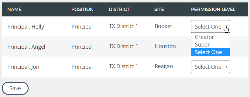From the results, select the correct permission level for the desired user(s), then click Save.