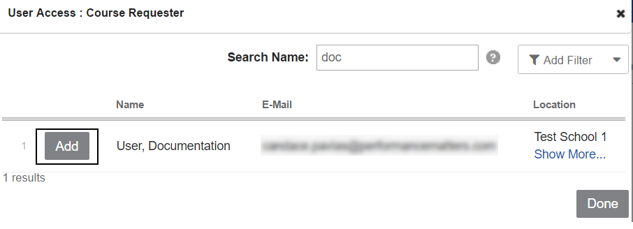 - In the pop-up, search or browse for the desired user, then click Add.
