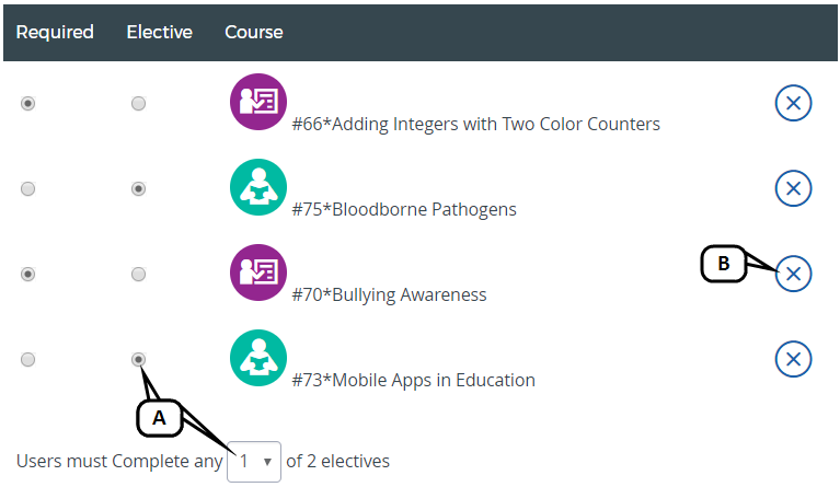 - Courses can be designated as required or elective. If electives are chosen, you can determine how many must be completed to receive credit for the playlist