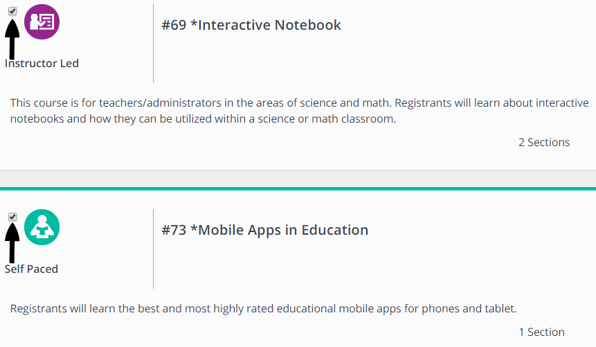 - The course catalog will display. Select the checkbox for each course you want to add to the badge requirements.