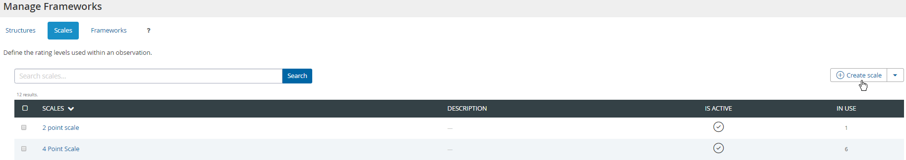 The scale is the portion of the instrument that indicates how many levels from which an Observer will make his or her selection. It may be a scale with three options, four options, or more. (Example of a four point scale: Unsatisfactory, Developing, Effective, Highly Effective)