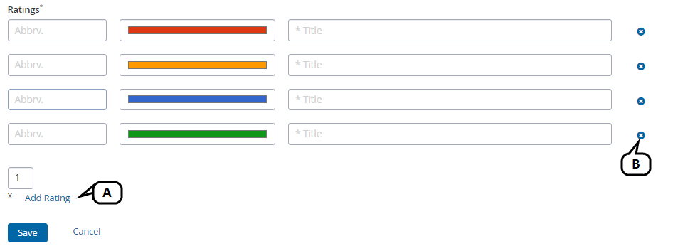 - Define the ratings for the scale. Enter the rating abbreviation and title and select the rating color. Color coding will display when the finalized observation appears in a list and in Insights reports.