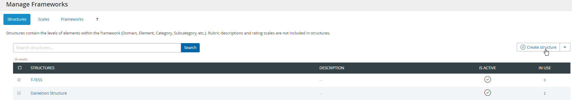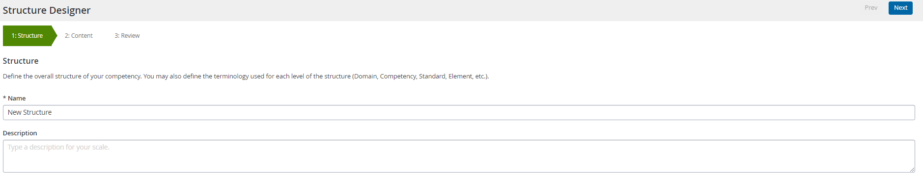 The structure is the hierarchy within your evaluation instrument. It can be set to define multiple levels of the tool, and as an administrator, you can give a name by which the level will be identified. (Example: Domain/Element/Competency)