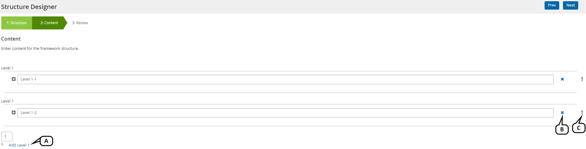 - Continue creating levels, sub-levels, and elements (steps 6-11) until the desired structure is complete, then click Next.