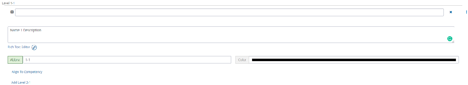 - Enter sub-level name, description, abbreviation, and correlations as appropriate. (Click the pencil icon to access an advanced text editor.)
