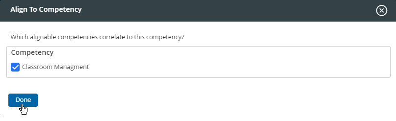 - Click Align to Competency to align competencies to the current level. Search for and select the desired competency(ies), then click Done. (If courses are aligned to the same competency, a light bulb icon will appear for the user.)