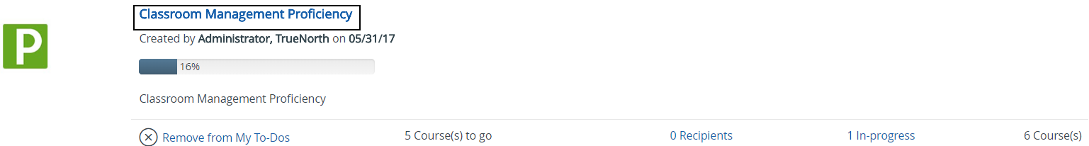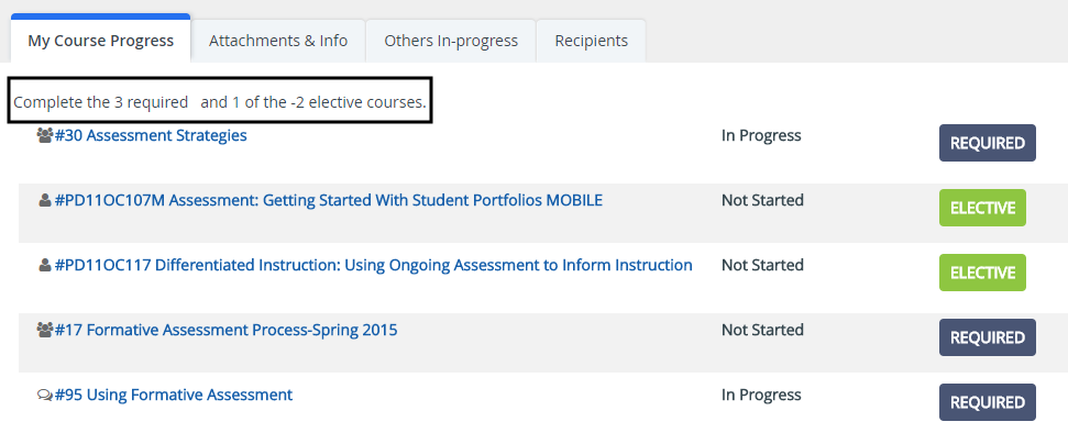 - The list of courses and your status on each is displayed. Click on a course name to open it. Courses may be designated as required or elective. In this case, the completion requirements will be provided at the top of the list.