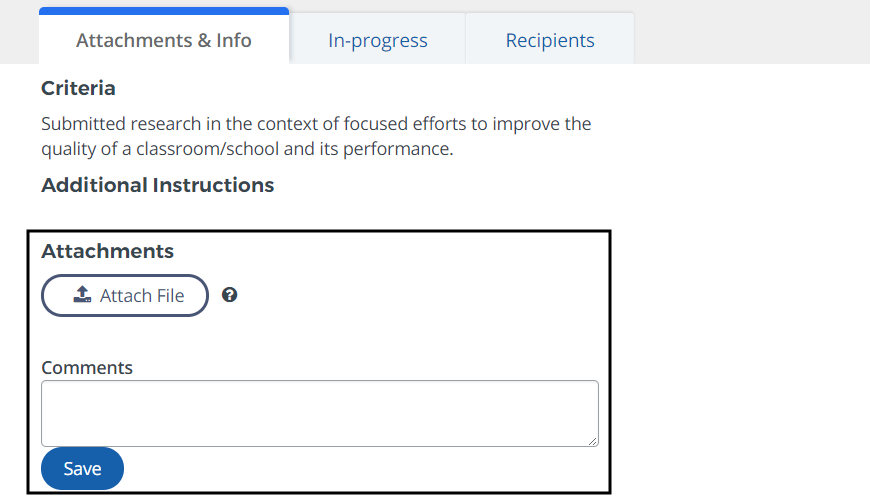 - Attach files and comments as necessary evidence to support your badge criteria completion.