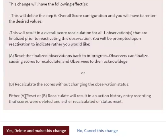 - Upon finishing, a warning message will summarize the observation instances affected by your changes. Click Yes, Delete and make this change to continue.