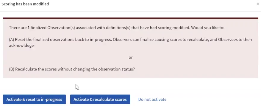 - Select Activate & recalculate scores to automatically recalculate finalized observation instances.