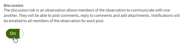 On the Discussion tab, click the toggle button On to enable the Discussion tab in the observation for use by the Observer and Observee. When done, click Next.
