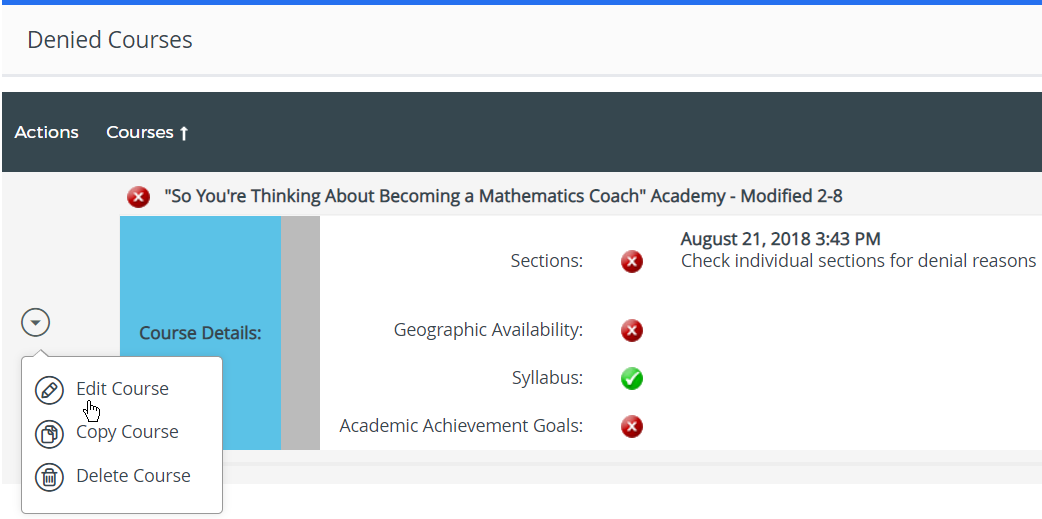 - Click on the Actions menu next to a denied course and select Edit Course.