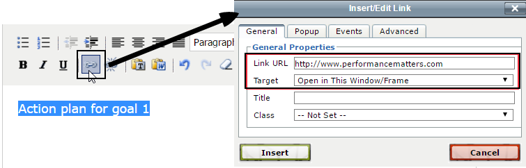 - Some text fields include an advanced text editor, allowing you to format text and add links. To add a link, highlight the text, then click the hyperlink icon. Enter the full URL and click Insert.