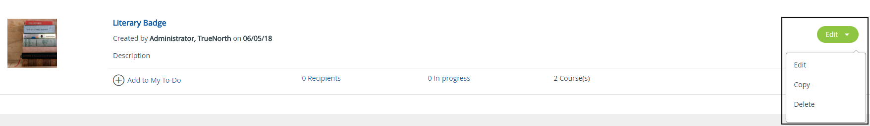 - Select Delete from the menu to remove the badge from the Library. If earners have the badge in their to-do or completed lists, the badge will be removed from the Library but will remain valid for their completion.