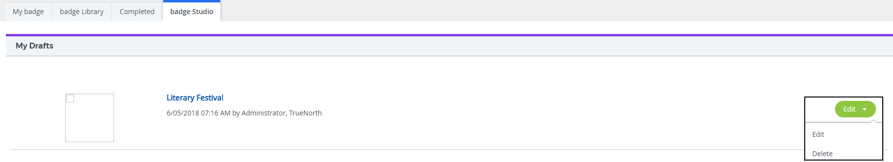 - Badges you created will display an Edit menu.