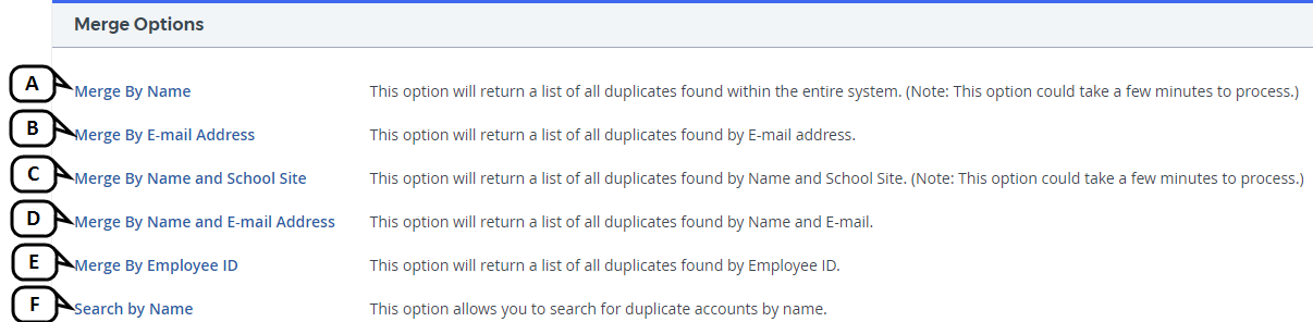 - Merge by Name and School Site: Select this option to view all users with duplicate names at the same school site.