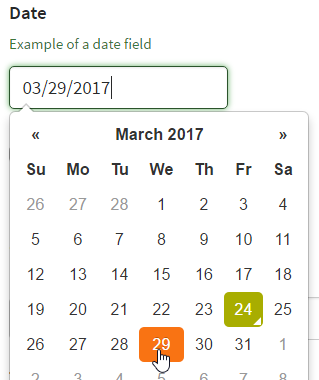 - Presents user with a single-line text field; when clicked, a calendar displays.