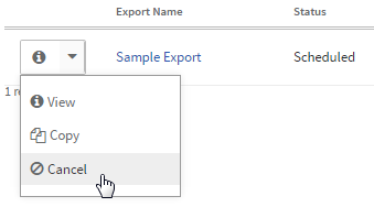 A scheduled export can be canceled by the user who created it. Locate the export title in the Export Queue list, then select Cancel from the drop-down menu. You will be prompted to confirm the cancellation.