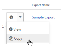 A scheduled or completed export can be copied in order to create a new export. Locate the export title in either list, then select Copy from the drop-down menu. You will have the opportunity to make changes to any of the original settings before scheduling the copied export.