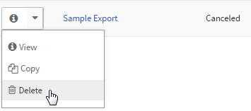 A completed or canceled export can be deleted before its Available Until Date. Locate the export title in the Completed Exports list, then select Delete from the drop-down menu. You will be prompted to confirm the deletion.