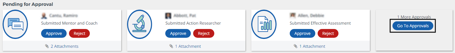 As a Badge Creator or Badge Super User, see the completed badges submitted for your review and approval. Click Go To Approvals to see all pending submissions.