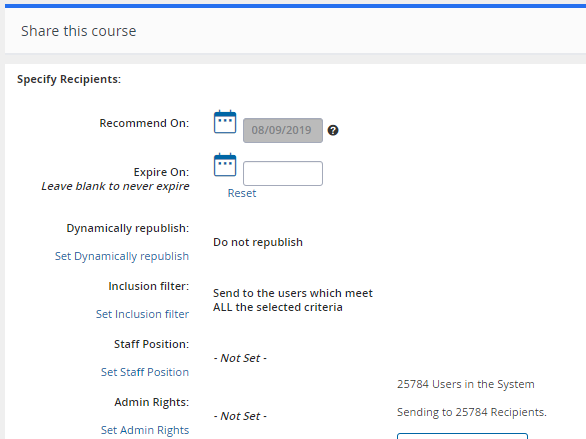 - On the Share this course screen, select when and to whom you wish to recommend the course.