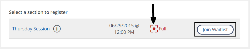 Once a course has reached its maximum enrollment, it will be designated as Full. If the course creator enabled a waitlist, Join Waitlist will display. Click Join Waitlist to be placed on the waitlist. You will be enrolled if a registered participant withdraws or if the instructor decides to override the max course enrollment setting.