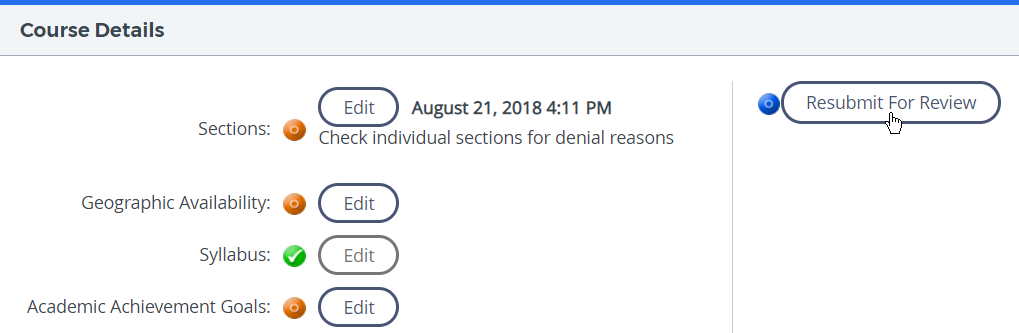 - Once you have returned to the Manage Course screen, click Resubmit for Review to resubmit your course and sections.