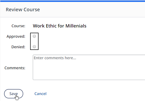 Select Approved to approve the course or Denied to send the course back for revision. Then click Save to complete this part of the process.