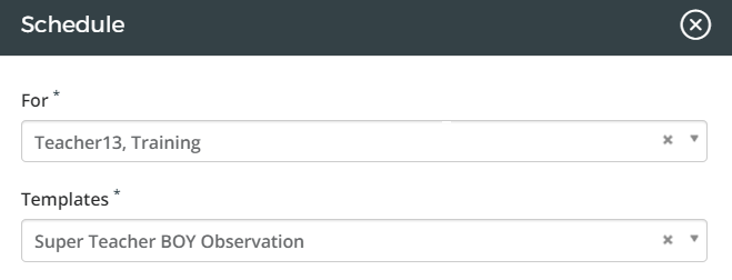 - In the pop-up window, select the Observee and observation template. Observee choices will be based on your role and location settings. Template choices will be based on the permissions of your role.