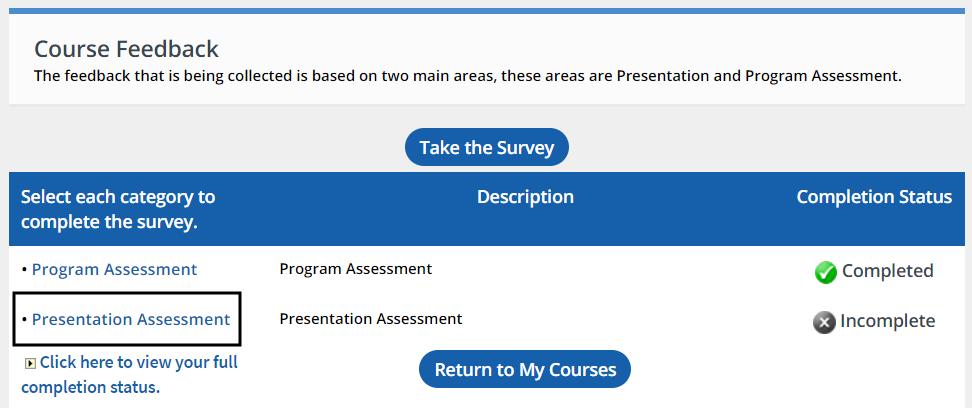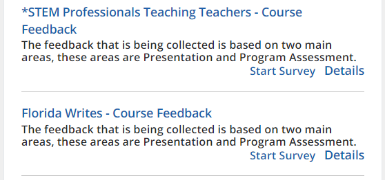 - Once a course is completed and the participant is marked complete, a survey will appear in this list. Click on Start Survey.