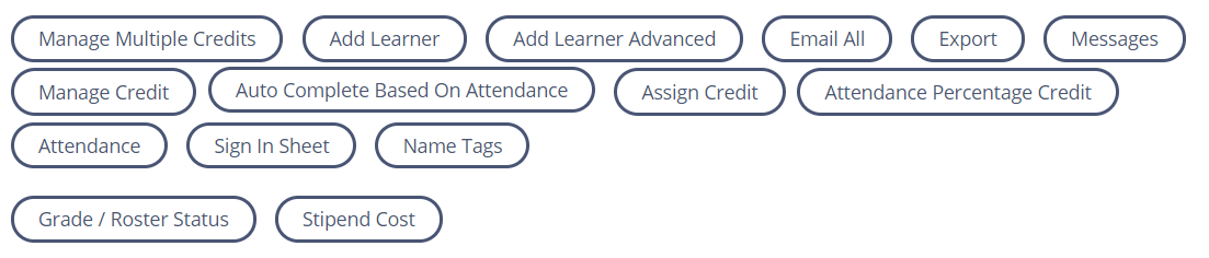 In the middle of the page, a set of buttons to access roster functions will display. (Buttons available will depend on course and section settings, as well as your role permissions.)