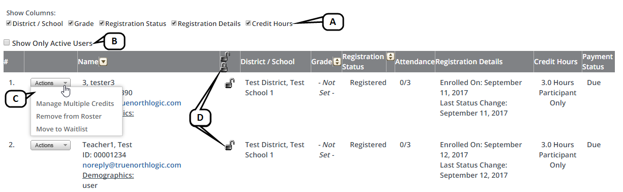 - Use the lock icon to prevent roster changes for a participant. Click the lock at the top of the column to lock every participant.