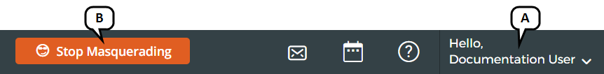 To confirm that you have assumed the correct identity, check the user name in the upper-right corner of the screen (A). To stop assuming an identity, click Stop Masquerading at any time (B).