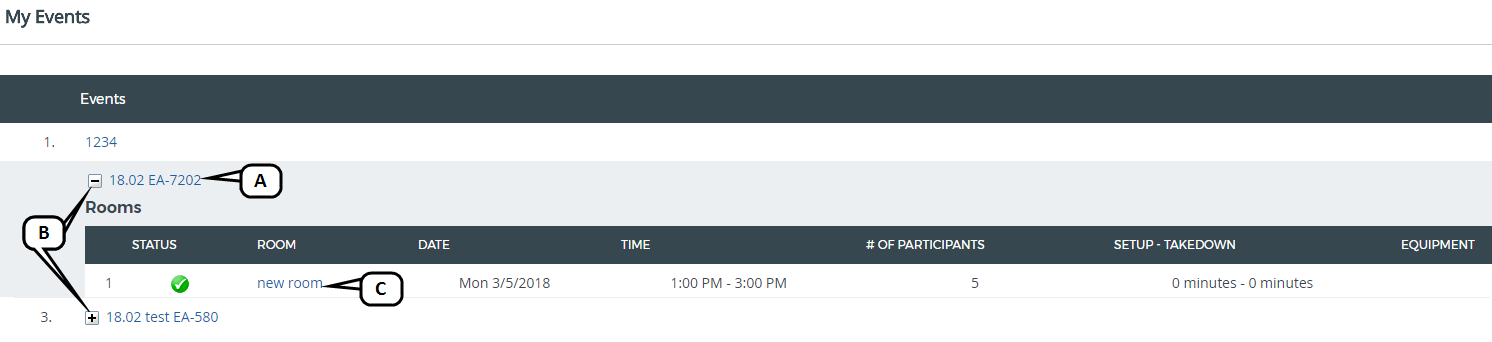 + or - : Click to expand or collapse the associated room requests for the event.