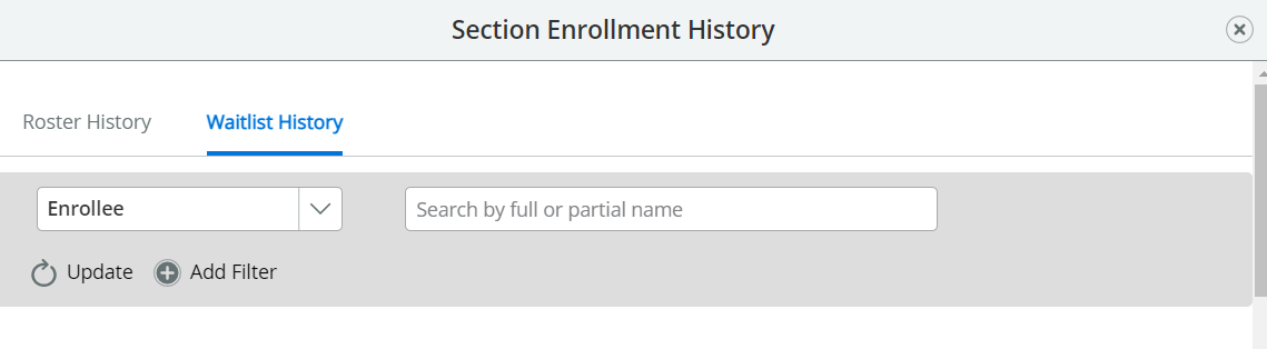 Professional Learning | Added Functionality to View Section Waitlist History in Section Roster | Functionality has been added to allow authorized users to access the Waitlist History for a section. This can be achieved by clicking the Section Enrollment History button in the Professional Learning Section Roster and navigating to the Waitlist History tab. ![]() ![]() |