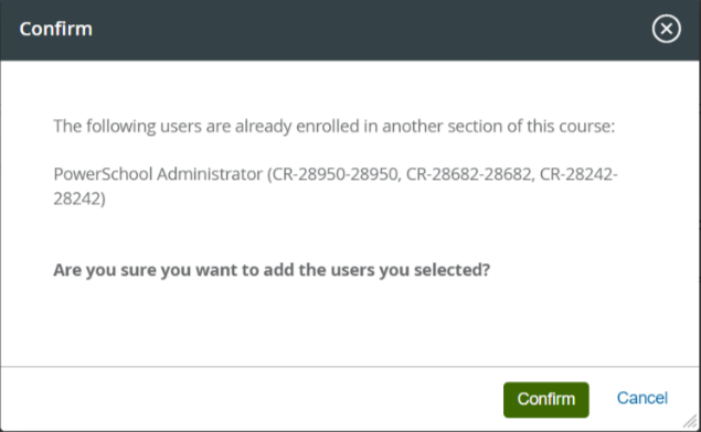 Professional Learning | Updated Section Numbers in Duplicate Course Enrollment Message | Professional Learning Administrators with access to course rosters will now see a comma-delimited list of conflicting section numbers next to the users' names in the warning message that appears when they attempt to add a user to more than one section of the same course. ![]() |