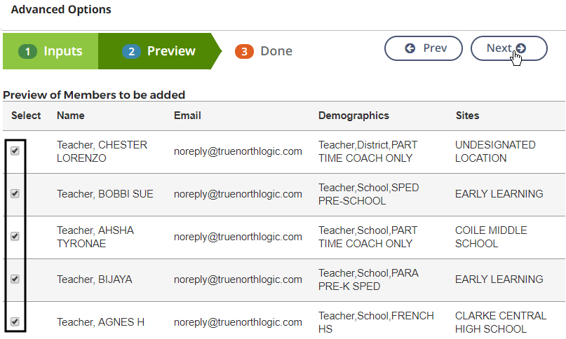 Preview the list for accuracy. Deselect any user to remove them. Then click Next.