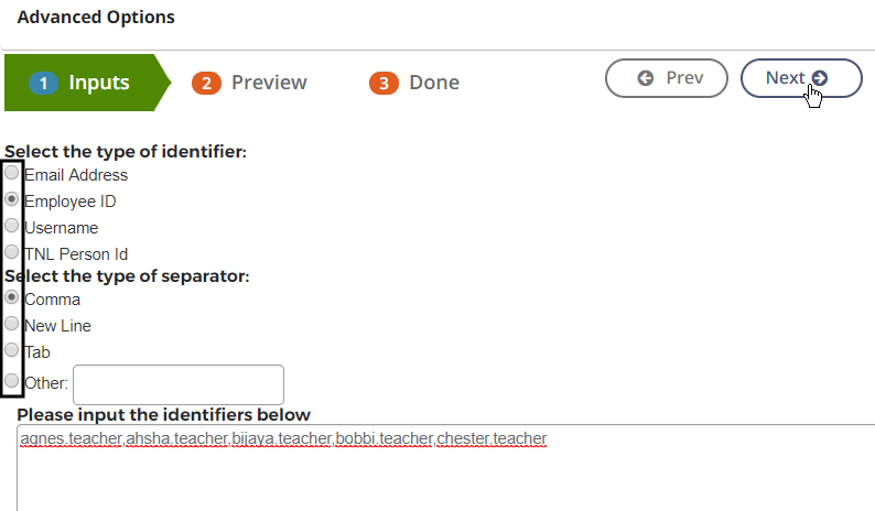 Select the identifier and separator to be used in your list, and enter the list in the text box. Click Next.