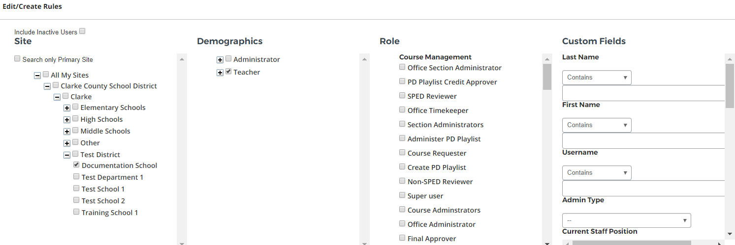 Rule criteria can be defined by site, demographics, role, or other user account field. Rules can be defined to include or exclude users meeting the rule criteria.