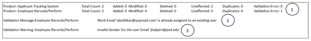 3 - Validation Warning | This section describes errors that caused partial failure when processing a specific row. A record can be added or updated in the product, but the problematic column remains unchanged. For instance, if an incorrectly formatted phone number is provided for a user, the user will be created or updated, but the phone number will not be updated. Refer to FAQ & Troubleshooting for different types of validation warnings. |